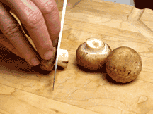 If possible, just wipe mushrooms clean instead of washing them. Cut off tip of stem and discard. If you want long pieces, slice the whole cap. If you want smaller pieces cut mushroom in half first and slice crosswise. |