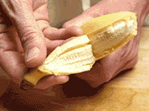 Peel the banana and cut lengthwise in slices about 1/2 inch wide. Take the slices one at a time, or 2 stacked on top of each other. Cut across the slices ending up with 1/2 inch cubes. |