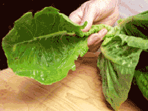 Remove outer leaves from head and discard as they are usually wilted, and discolored. Cut tip off lettuce head and discard as it is tough and bitter. Make a cut lengthwise through the entire head of lettuce. Turn cut side of head to the side and cut again, so the head has been cut into fourths leaving root end intact. Then slice thinly up to the root end and discard root. |