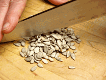 If you want coarsely chopped sunflower seeds it is best to do this with a chef's knife. With a small pile of seeds raise knife up toward tip and lower blade toward base in a rocking motion, chopping the seeds. If done somewhat slowly the seeds will not fly around. |